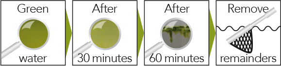 In ponds floating algae often causes problems with green water. When Algadrex is added to the water it will become clear in less then an hour.