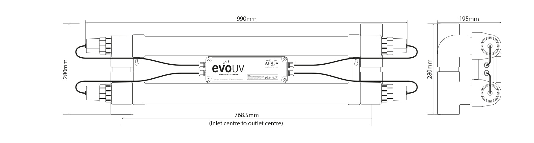 The distance between the centre of the inlet and the centre of the outlet is 768.5mm. The evo110 uses two standard length 55W T8 UV bulbs.