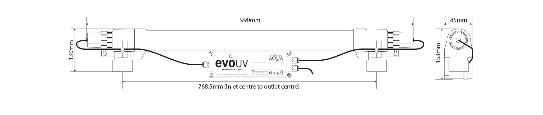 They are 990mm (l) x 85mm (w) x 153mm (h) excluding hosetails. The distance between the centre of the inlet and the centre of the outlet is 768.5mm. The evo30 uses a standard length 30W T8 UV bulb and the evo55 uses a standard 55W T8 UV bulb.