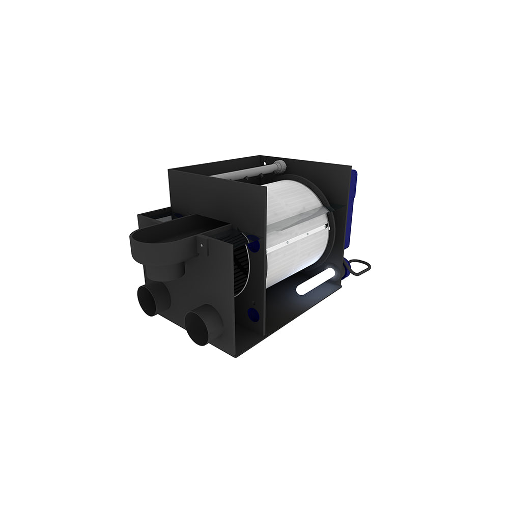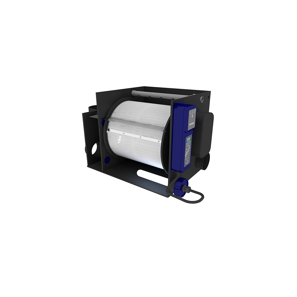 The Filtreau Drum Filter (Gravity) is designed for ease of use and maintenance. It features a quickly changeable modular design, allowing you to replace components with minimal effort. The body dimensions of 79x48x54cm (total length including waste collector) provide a compact footprint.
