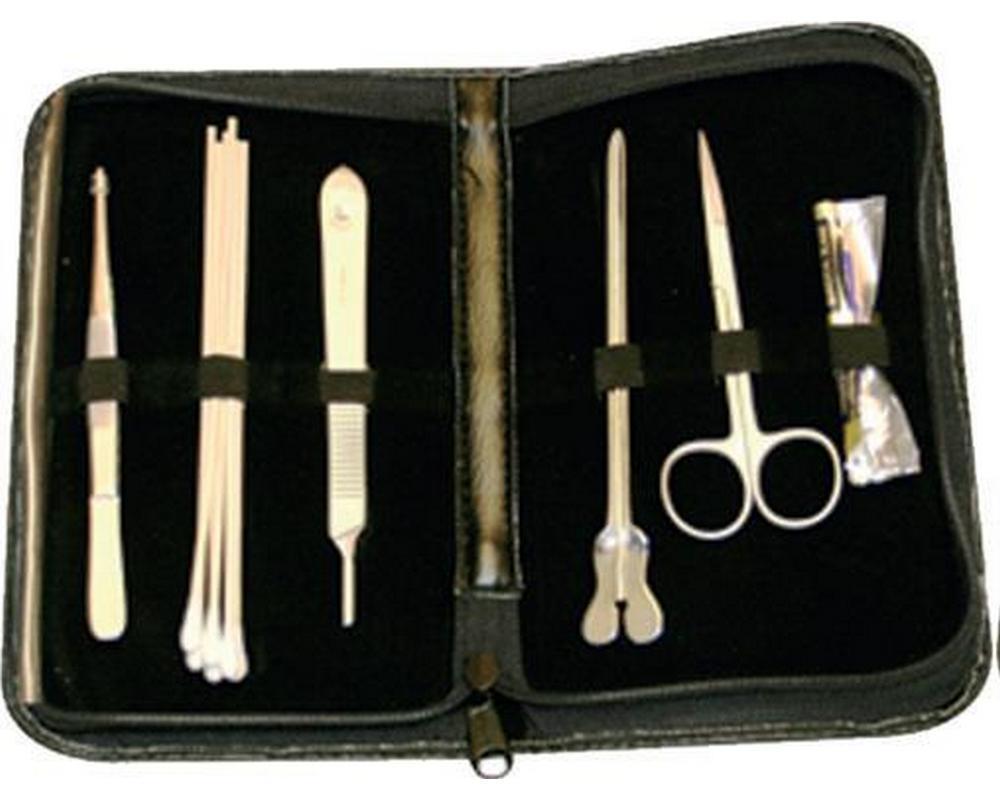 scalpel blades, handle, radius scissors, butterfly probe, single